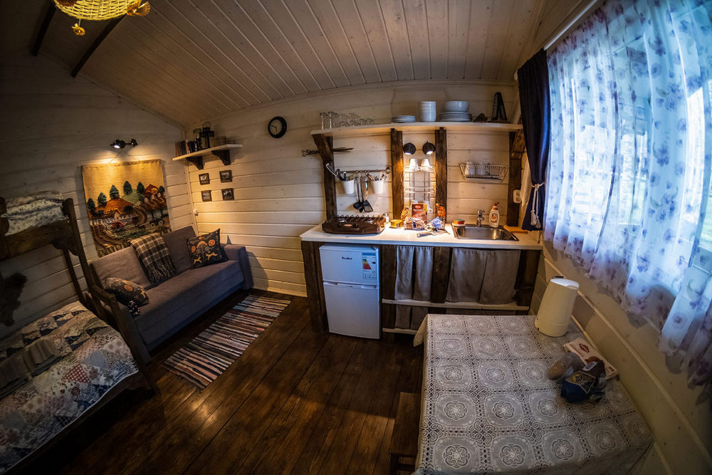 - ДОМИКИ на три основных спальных места (и два дополнительных) снабжены собственной кухней и крытой террасой с мангалом. Домики обустроены в деревенском стиле, наполнены ароматом древесины и свежести. В дизайне использованы только натуральные материалы, включены этно-элементы. Каждый предмет дышит спокойствием и семейным уютом.
