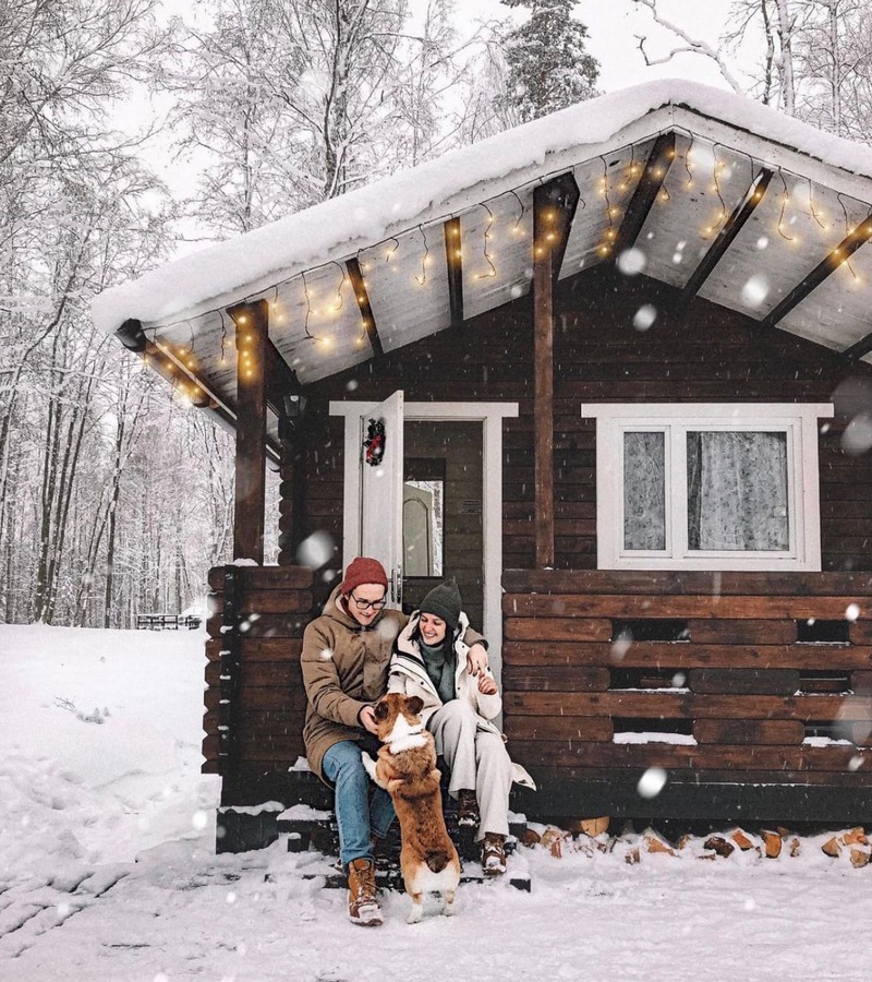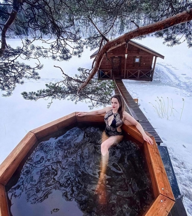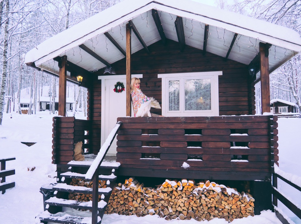 - Территорию базы. Наши гости любят фотографироваться на крыльцах деревянных домиков, около бани, в специальной купели с горячей водой. Эти снимки передают особую атмосферу холодного времени года.