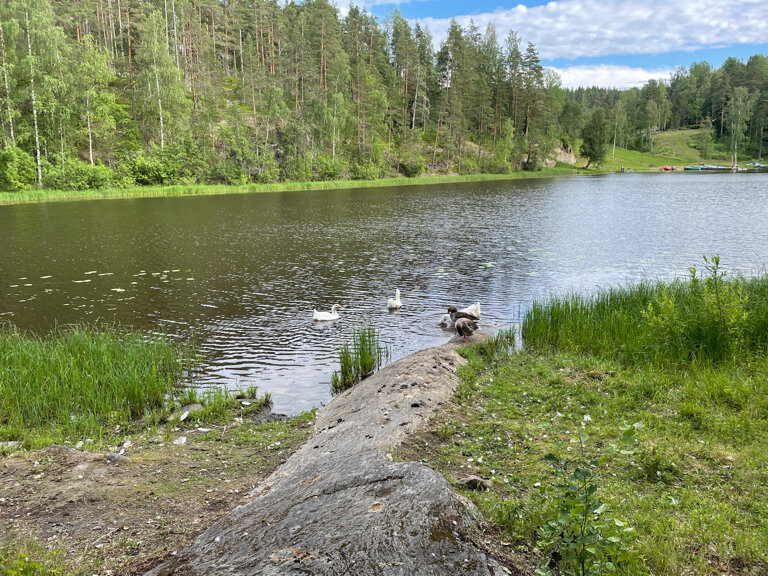 На территории турбазы живут кролики, курицы и два енота. Еноты – это что-то! Еще гуси, которые ходят сами по себе и ведут себя как полноправные хозяева. Вся территория – считай, лес, причем березовый, очень красиво. Есть пирс, с которого комфортно купаться, там же прокат лодок. Прокат по очень гуманным ценам, и это одно из основных впечатлений от отдыха – поплавать с мотором среди островов и выйти в Ладогу. Для детей также есть батут.