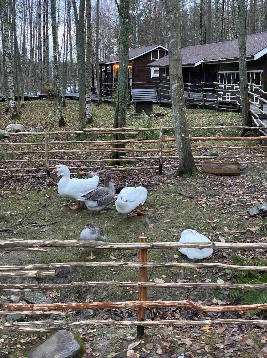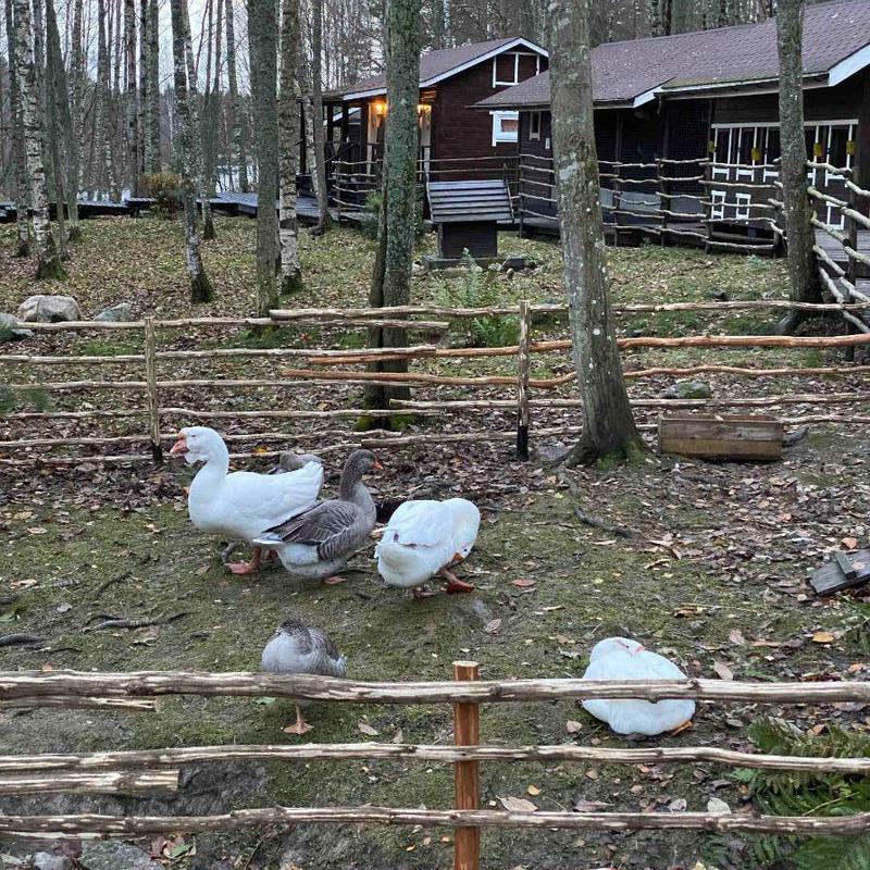 На территории много живности: куры, гуси, цесарки, кролики и два енота. Все чистенькие ухоженные, как вся территория вокруг – в идеале. Можно на завтра приобрести яйца местных кур. Душ и туалет в отдельных домиках, все раздельное, комнаты большие и чистые, абсолютно не напрягает. Персонал приветливый.