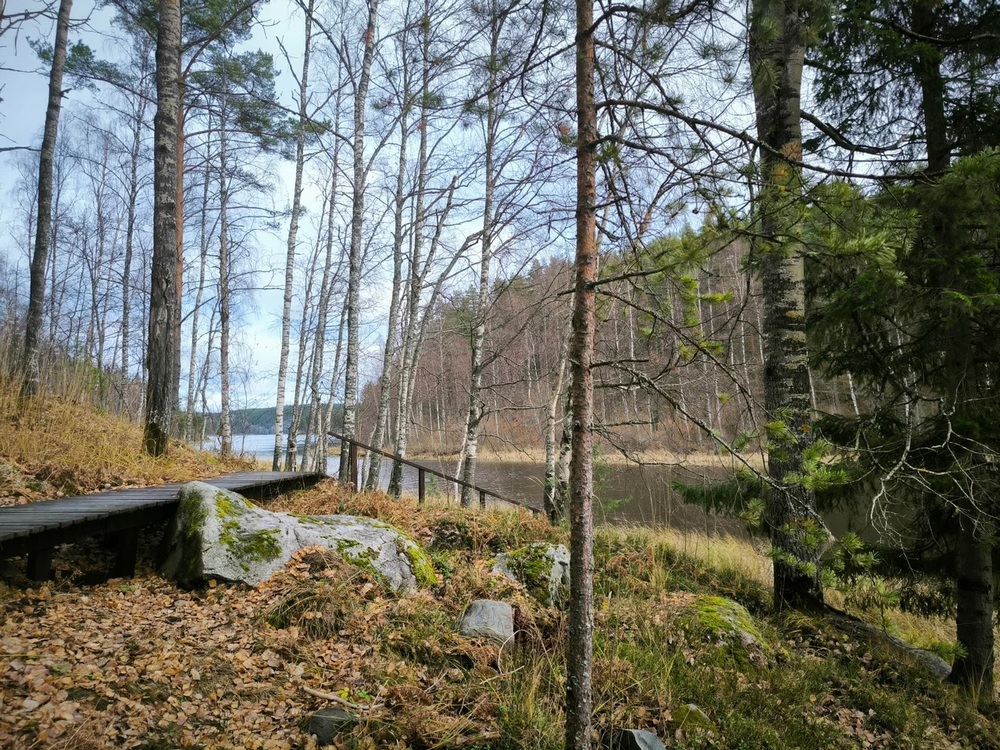 Утром встали, увидели, где мы и что тут, а тут красиво очень, везде мостки, домики очень удобно друг от друга, у каждого домика есть запас дров, мангал. Вдоль пролива тоже мостки, природа...